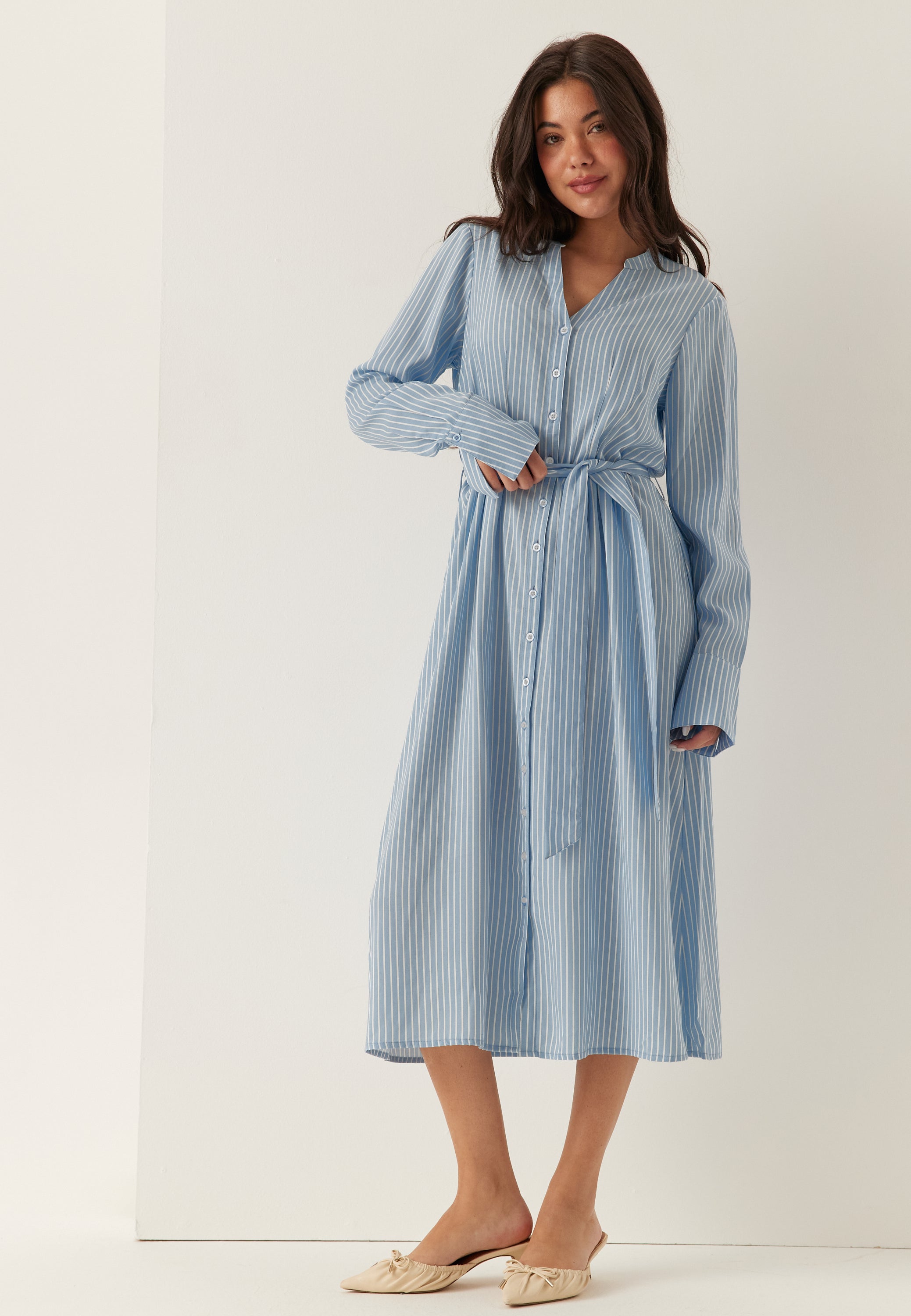 - Bell-shaped fit with a removable tie belt