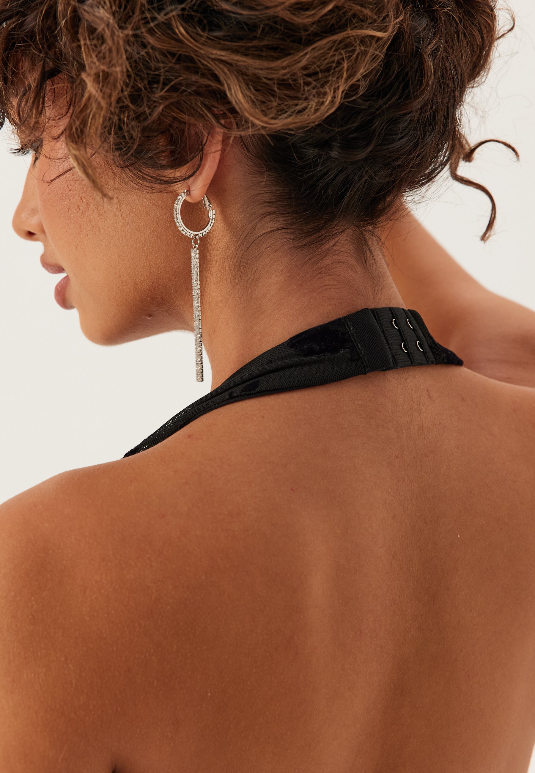 - Halterneck with hook-and-eye closure at neck