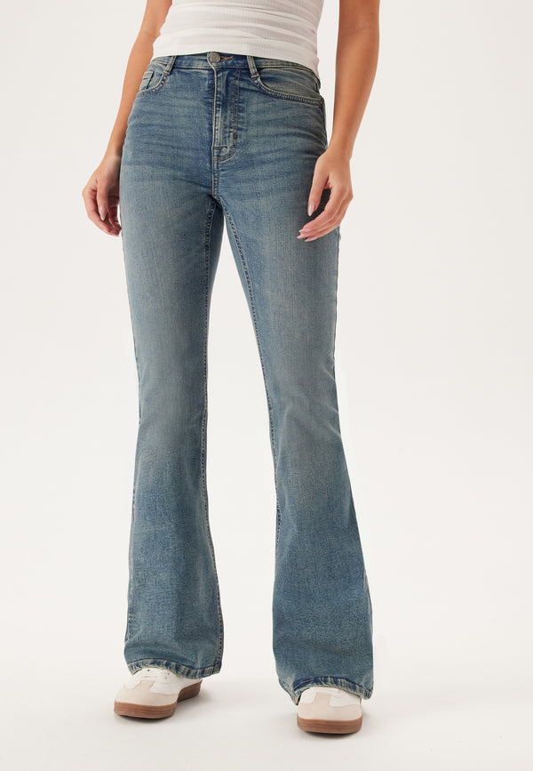 - Nauwsluitende en dunne pasvorm met flared benen